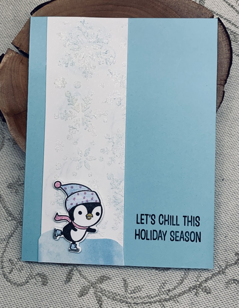 Yesterday I was fooling around with stencils and I created a few different panels. I cut one down and used the smaller piece for this card. It is a snowflake stencil, but I’ve forgotten by whom. I used some glitter glaze by Brutus Munroe through the stencil and when dry added a bit of ink very lightly over the raised portions. After adding it to the blue card front I added a small piece at the bottom to give the illusion of a rink and added the little penguin from a new YNS set. Sentiment part of that set too. I used some of the colours from the Moodboard to colour in the penguin. Decided to keep it totally CAS so no other embellishments.