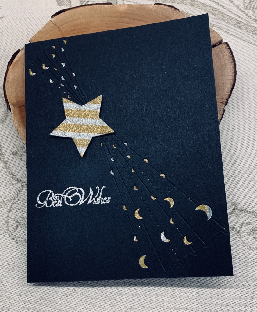 Instead of splitting my card using paper I chose to do it with a die that works best on the diagonal. I then backed it with some glitter CS behind so that it twinkles through the openings. Using the same CS I die cut a small star using Hero Arts Infinity dies using foam tape to attach it. The sentiment is from a Joy Clair set and I heat embossed it in silver. I chose this particular sentiment as it gives me choices in how to use the card.