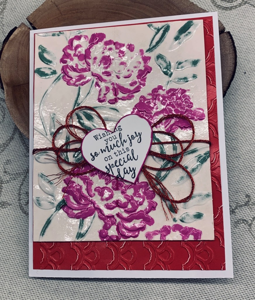 There was a technique shown on Pinterest that intrigued me enough to take a closer look so I followed it to this URL – https://www.youtube.com/watch?app=desktop&v=h5RjkDo_eOA The demonstrator uses packing tape with an embossing folder. I thought it was interesting so did my own take on the technique. Initially I followed her instructions but I added to them. I found a small very pale pink piece of scrap CS that I covered with the tape and then placed into an unbranded EF. I love the 3D effect this folder gives. I found it was a bit too pale although I really liked the shine from the tape. I didn’t think I could colour over the tape so I decided to let a couple of alcohol ink pens bleed through from the back. This only worked because the CS is very thin but it sure made a difference to the image and I really like the effect. Using another piece of scrap this time in red I put that through a regular EF allowing the slight white cracks that resulted. I added foam tape to the focal piece and a red twine. I couldn’t tie a bow for love nor money today so I scrunched it over some tape and then added the heart sentiment on top. I used one of the pens around the edge of the heart. Once I was happy with the focal piece I added it to the red layer deliberately setting it from the upper left corner and then it was added to the note card.