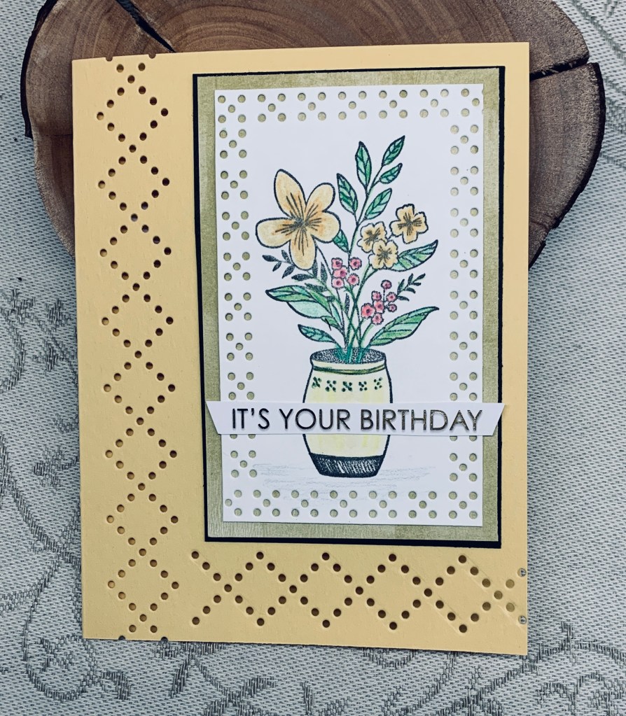 Meg has chosen Spring flowers as the theme for our new challenge here at MMM. In my mind yellow says spring so I chose a new stamp from StampinUp called Everyday Details and some dies that came with the bundle. Initially I began by stamping and colouring the image using a combination of Prisma pencils and some alcohol pens. I trimmed the panel to size and added the detailed edge using two of the dies after which I added it to a layer of PP also from StampinUp and a black layer under that. Before adding the entire piece to the yellow card front, I took another of the dies and added the detail along the side and bottom. The foiled sentiment is from Paper Rose but I cut it apart and added the other section inside the card.