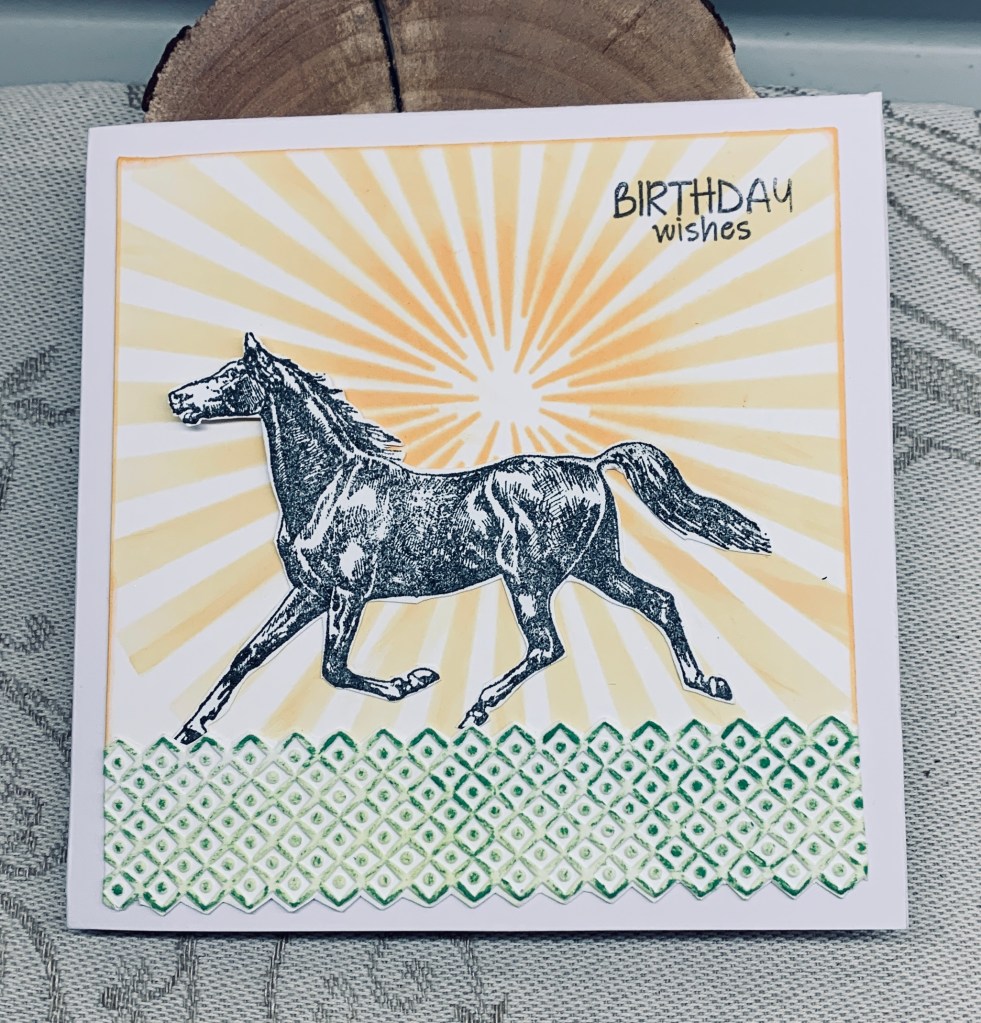 It has been a few weeks since I stenciled this background and I decided it was time to use it. I took an old wooden block stamp and stamped my horse using a little heat embossing to give him some shine. Then he was fussy cut. I attached him to the background and put the entire piece to the side as I had another project with a deadline to complete. Today I took another look and decided to add an embossed border using a small unbranded strip folder. The pressure was strong enough to slightly damage the edges so I fussy cut around it and then added some inks before adding it below my horse. Added a yellow border using a pen before attaching it all to the card front. The sentiment is from a Kokorosa set.
