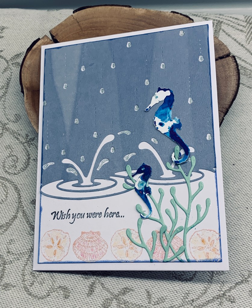 The seahorses were die cut and then smooshed through some wet colour burst powder. After gluing down the seaweed I added the horses by twisting the weed through their tails and a dab of glue at the top. A little sparkle through the raindrops is all the embellishment I used. I forgot how little of the Colour Burst powder one needs so I’ve been mopping up the remainder and making a big mess everywhere. I’ll have a few scraps to use later because of this. Thank goodness for my glass mat.