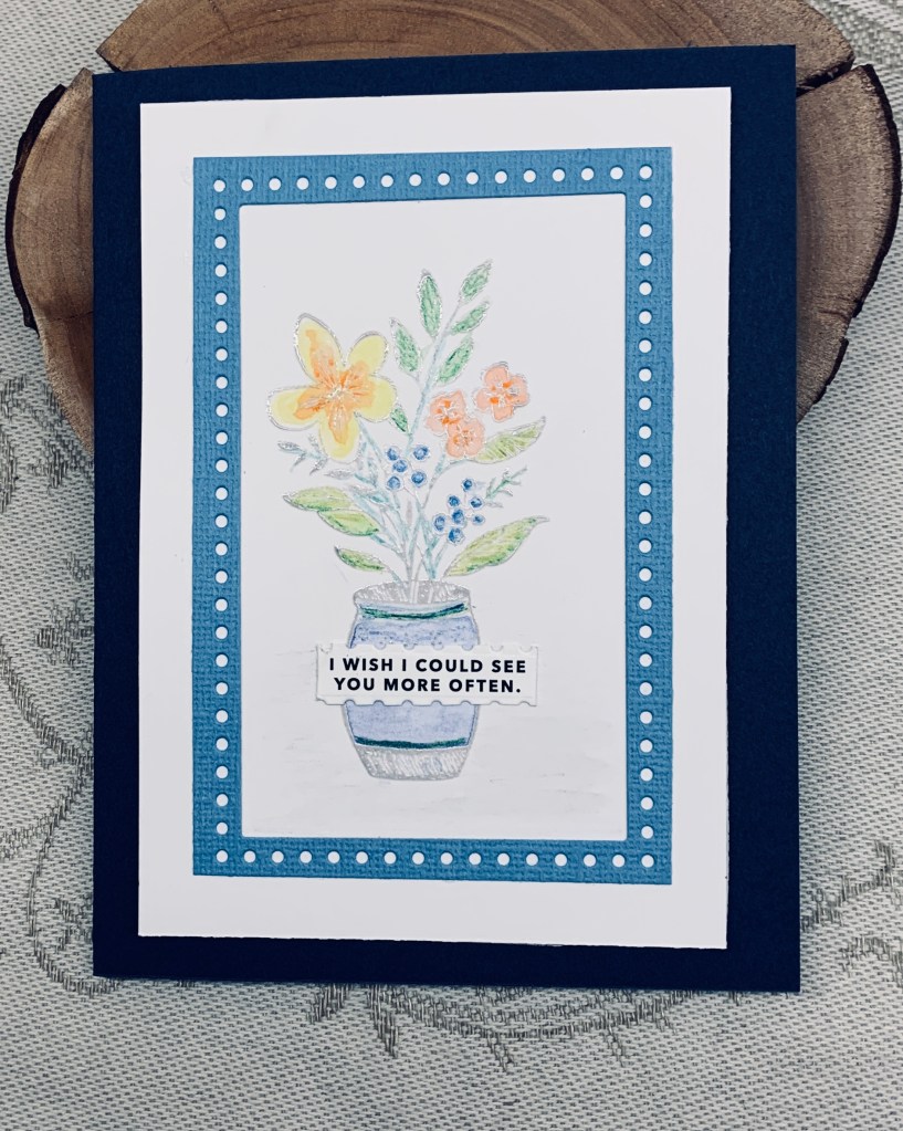 The challenge at Just Add Ink is all about incorporating a fancy edge. I love the new bundle set I bought from StampinUP called Everyday Details and I had this die cut frame left from a different project. Taking one of the stamps from the set I stamped in Lost Shadow ink and then heat set clear. Once cool I added pencils and a water brush to blend them but kept it fairly pastel so it stayed soft and pretty. I did ground the vase with a gray pencil, but the photo doesn’t pick it up. I added the frame and using a foam backing mounted it on the Navy card front. The sentiment is a cut apart, but now I’ve forgotten which company I got these from. I used a small border die to cut this one keeping it very small.