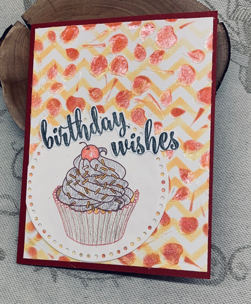 A while back there was a challenge asking us to double stencil and I tried it with this background piece. It didn’t really work and I wasn’t sure I liked it so it was set aside until now. The current challenge at Seize the Birthday is about fruits and I figured that the cherries here fit the bill even though I’m still not sure I like the panel. What I did to make it look a little better, was to replace the stencil (took a bit of figuring) and use an opalescent stardust butter to add some shine to the cherries. When dry, I cut it down and added it to the card front. After die cutting the white circle using a StampinUp die, I stamped the cupcake image using a GKD set. Sentiment is also from GKD. I coloured the cupcake with metallic pencils, a couple of glitter pens and I also glittered the sentiment. I fussy cut the sentiment and then cut it in half so I could add it as you see.