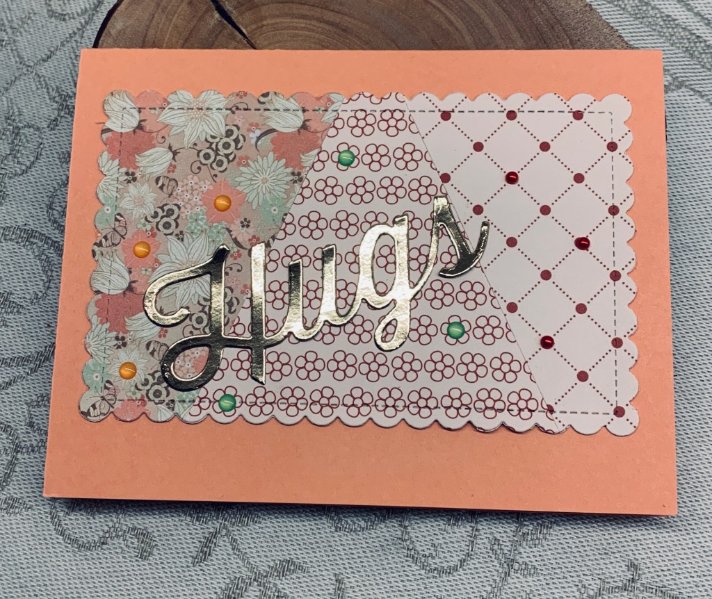 Having seen Natasha Foote create a few cards using PP and something similar in design to the ones posted here, I decided to enter my card into the challenge at https://lovethoseprettypapers.blogspot.com/. I simply followed the example by Natasha, but added my own spin. In this case my PP panel is smaller and I wanted to have a border behind so I used some holographic paper to create one. My PP is from some freebies that came with a long ago crafting magazine, can’t even remember which one now. I used an unbranded rectangle die set to cut my finished panel. My sentiment is from a Creative Expressions set, and cord is from my stash.