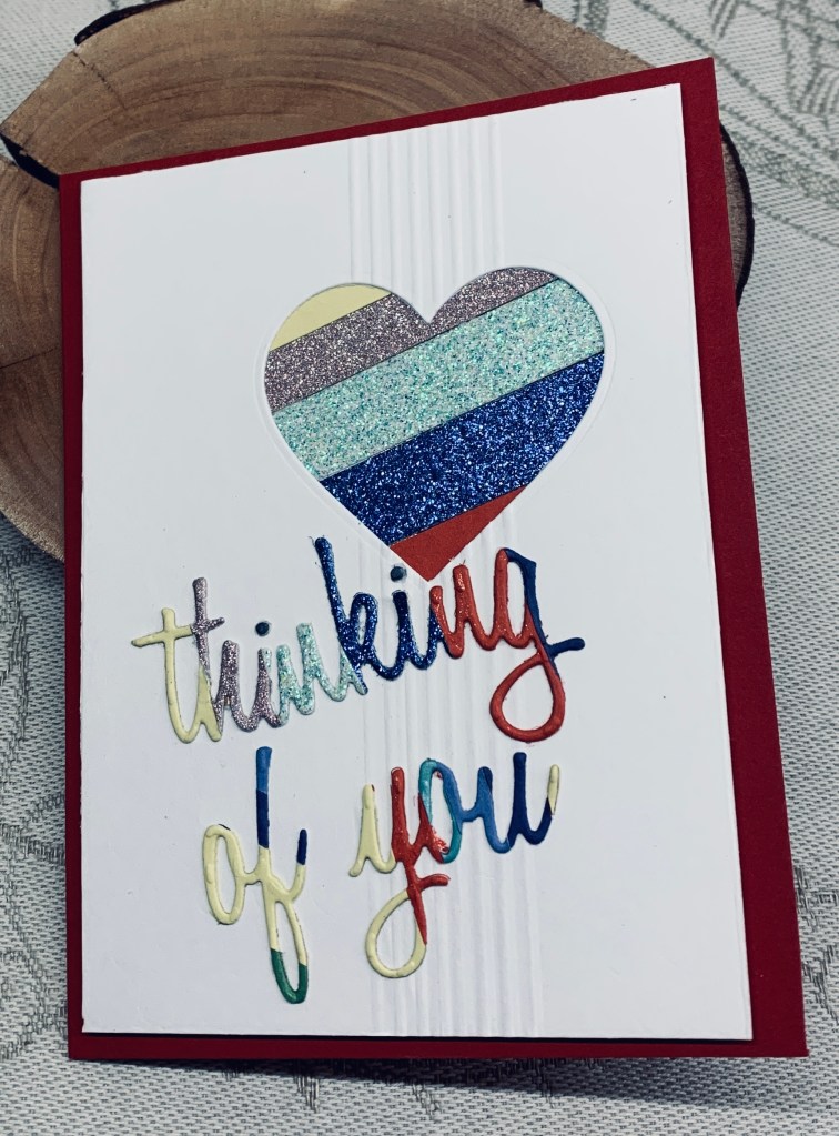 Just Add Ink has a sketch challenge and while my card doesn’t follow the sketch exactly, I am still entering it. As you can see, I used one of the striped pieces behind the negative heart and the leftover piece was die cut with some Sizzix word dies to create the sentiment. They cover up the poor scored section perfectly. Original heart was cut with infinity dies.