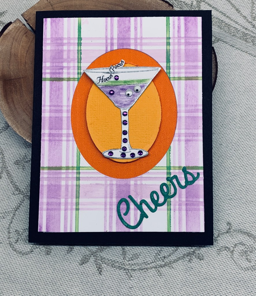 We are close to Halloween, which I have to say is not my favourite night of the year, and Sue is challenging us to use at least 3 of the following colours: Purple, Orange, Black and Green. She will also be choosing the winners here at Cardz4galz. I have used all of the colours due to the black card front. First off I took a Taylored Expressions stencil set that makes plaid. Using Milled Lavender, Wilted Violet and Mowed Lawn Distress Oxides I produced this plaid piece. Then I die cut the Oval (I can use the cut out on another card) I backed it with the dark orange which was heavy enough to lift the panel up slightly. In my stash of orange bits and pieces I came across the lighter orange piece which was already on foam and used as you see here. The word was die cut some time ago and was waiting for the right card so this was added at the bottom at an angle as it helped to cover up a small ink blotch. The martini glass was stamped (Joy Clair) in Versamark ink and then heat embossed silver. I fussy cut this and coloured the contents in purple and green for a potion look.