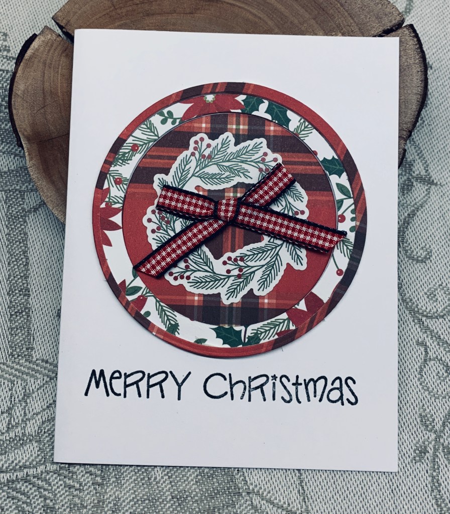 Krafty Chicks challenge #742 – Christmas and I created a paper wreath. I was just fooling around cutting paper and out of curiosity wondered how it would look if I used both sides. I die cut the first circle frame using Hero Arts infinity dies in 2 sizes. Then did the same thing but this time used a smaller die to make a wider frame. Then the smallest circle became the center. When I put it together, I glued the center flat, the thicker frame was turned over and has foam tape to pop it up slightly and then the outer frame used thicker foam. The image on the center circle is ephemera that came with the paper and the bow is from a store bought card from last year. Sentiment is from YNS.