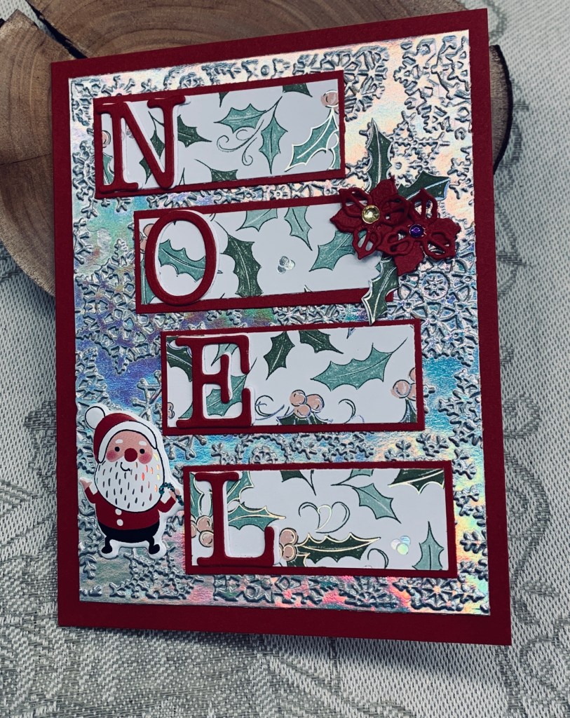 https://daranddiane.blogspot.com/ This challenge is about winter so I created a snowflake background using an old folder by Cuttlebug on silver CS. Using a lot of scraps I figured out sizing and cut background pieces and PP to fit before adding them to the embossed piece. Using a Scrapbook.com alphabet die set I created the word in both red and white so I could offset the top layer slightly. Added them to each strip. I found the tiny poinsettias in a box that I had made from last year and added them as well as the puffy sticker Santa before adding the entire panel to the red card front.