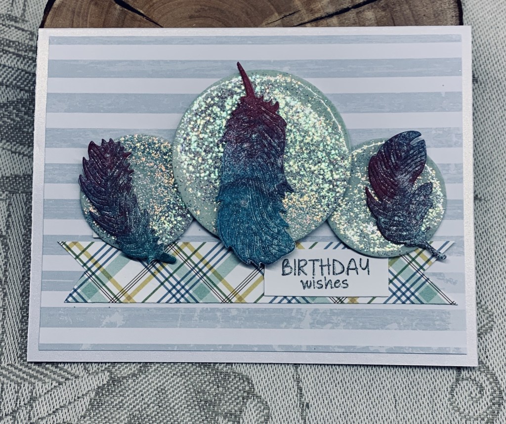SSC350 Circlin’ Around is the current challenge at Sunday Stamps. As I’m still using up different scraps sitting around in an effort to clean up my craft room, I decided to use these leftover circles cut with Hero Arts infinity dies. Using Distress Oxide Speckled egg ink I added the colour then I carefully added Versamark ink on top and used Ultra thick embossing powder in several layers, after which I used a glitter EB powder which sank into the glossy layer as it melted, to look as you see it here. I was quite happy with how these looked when done, but I’m wearing the glitter and my floor is also wearing it. I guess that is why I don’t use this system much, lol. On another piece of CS, I sprayed 3 different colours of Mica spray all over it and when dry used some Spellbinders feather dies. These were added to the circles using foam tape and the circles also had foam tape added to the backs to lift them up from the background layer. The PP is from both a paper pad and Crafters Companion, the sentiment is from Kokorosa. In my last post I said YNS, but I had it wrong. Once it was all assembled I quite liked the end result and it is very sparkly and shiny in R.L. Hubby likes it too.
