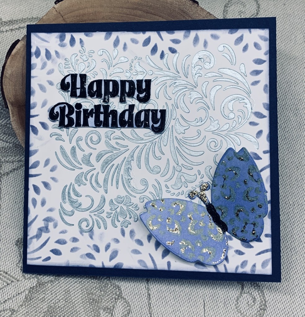 I haven’t used stencils anywhere near as much as I probably should, so this challenge is a good one to get me using them. I had this scrap piece of square card and a new stencil from Crafters Companion to use. I also had some new stencil butter from TWC, and decided now was as good a time as any to try it out. The stencil is a multi pattern one so I chose the section I wished to use and when it was completed set it aside to dry. While it was drying I added ink to the die cut butterfly – from MFT – and then used another of the stencil patterns on top. It needed a bit more definition so I added the black body with a glaze pen and some stickles in gold. This was set aside to dry and as the other piece was now dry I went around the edges with a darker blue and a third part of the stencil until I was happy with the coverage. The sentiment is a freebie from Catherine Pooler I think. I inked around it but didn’t like the result much. In the end I used a black glaze pen on the letters and when fully dry cut the sentiment by hand. This I liked much better so I added foam tape and placed it as you see. The butterfly was added and then the entire panel added to a Navy blue card front.