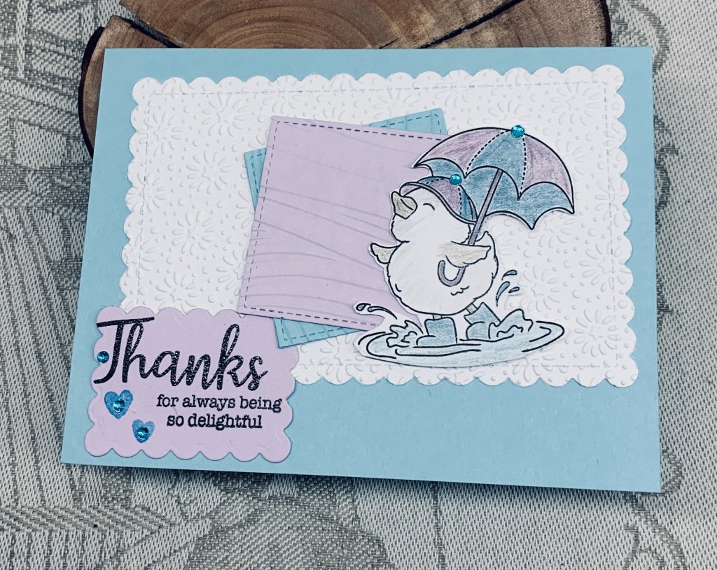 Sweet, pretty card with the lilac and aqua colours. I like the scalloped edges which really sets the card off. The little chick splashing in the water is adorable and the bling or rather gems is a nice touch.