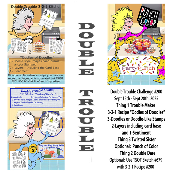 Challenge #679 here at Double Trouble is to make a doodle style image card. You may hand draw, use a stamp or die as long as it looks like a doodle. You need 3 doodles, 2 layers including card base and 1 sentiment. If you wish you can take the optional thing 3 by Twisted sister and do a pop of colour and thing 2 is to use the sketch and enter into TSOT as long as you take care not to backlink.