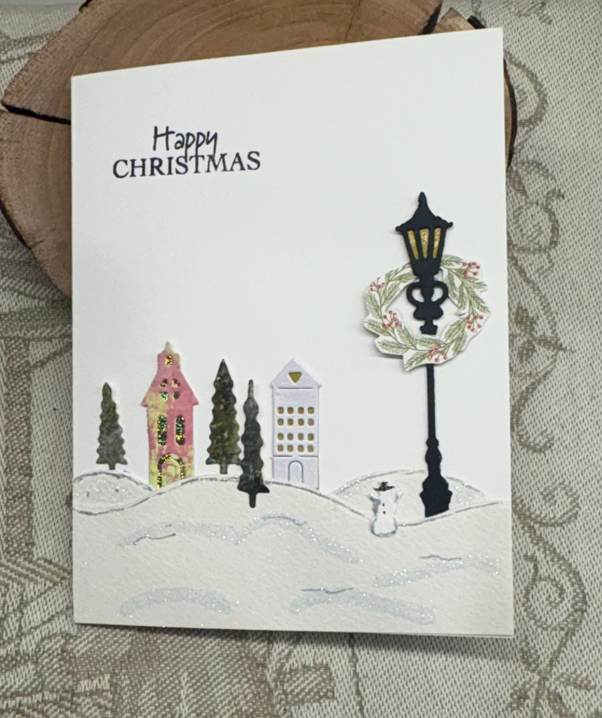 To make my cards, I used a lamp die by YNS, and an unbranded die set that includes wavy dies to make hills etc. My wreaths are cut from a scrap piece of last years PP and by cutting out the center I was able to hang it from the lamp post. The sentiment is from a Woodware set. I used a gold glitter pen on the lamp light. The little houses were bacled with some gold paper and my tiny trees are cut from a scraps. Using a Sakura glitter pen I added some lines to the hill tops and snowman as well as to the berries on the wreath. I felt the snow needed more so using a glue pen and super fine StampinUp glitter I was able to make it sparkle. The other two cards were done in a similar fashion only one has been sprayed and the other uses the super fine glitter. I quite like the simplicity of these cards and they are still flat enough to mail easily, if and when the service goes back to work. I think the postal strike has been a factor in my lack of mojo.