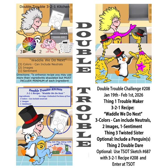 Welcome back to a new challenge here at Double Trouble. Our 3-2-1 recipe Waddle We Do Next, is asking for 3 colours, 2 images, 1 Sentiment, with a twisted sister dare of adding a Penguin. In addition you may enter your card into our sister challenge at TSOT, but ensure you don’t accidentally back link.