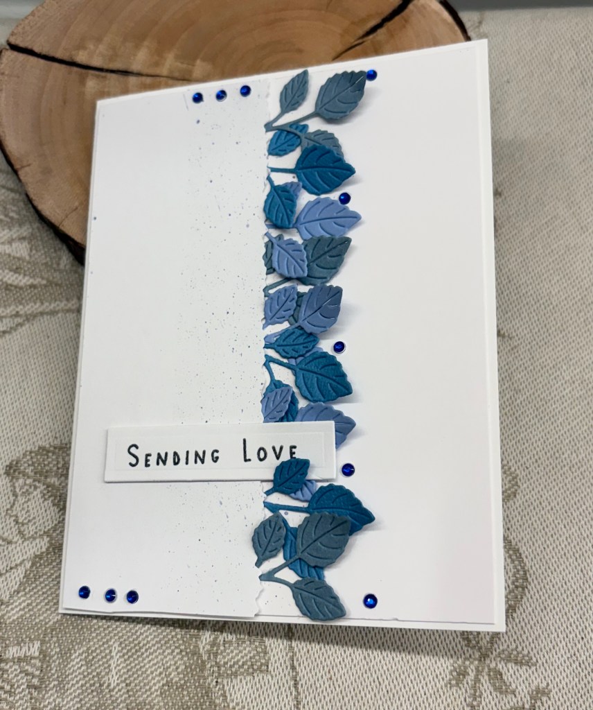 This card has been finished and on my computer desk for several days already. So much going on that I didn’t have an opportunity to post it till now. I made with the challenge at Color Hues Challenge #125 – Blue and White in mind. I saw something on Instagram where a crafter posted a few different colour versions of a card similar to this, but I can’t find it now so cannot credit her with the idea. I basically took her idea but changed it up enough to make it my own. I used a Memory Box leaf die and different blue scraps of card stock to cut out about 12 leaf sprigs with several in each shade of the blue. Using another scrap piece of white card, I deckle edge cut it to the width I wanted and then spattered some dark blue ink along the edge. After that I added foam tape and set it aside for a moment. Using another white scrap piece I added a single layer over the card front leaving a tiny border all around, then I added the other piece to one side of this. I had ensured that the foam tape was far enough away from the edge to tuck the leaves underneath which I proceeded to do. The sentiment comes from a Catherine Pooler set and I tucked this into the leaves a little when I placed it. After adding a few embellishments I called it finished.