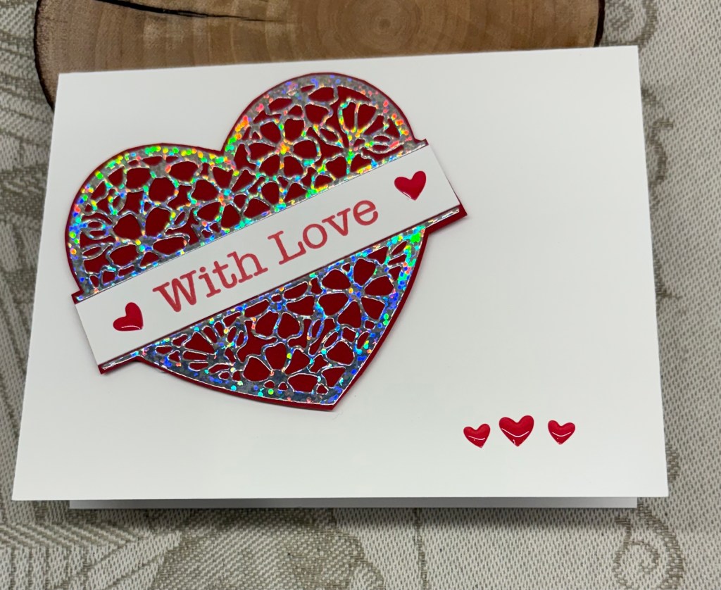 It is such a shiny heart from using the holographic paper. My hubby is fascinated with this specific die and wants me to make another without the sentiment so he can photograph it and add whatever he wishes to the space between the shapes.
