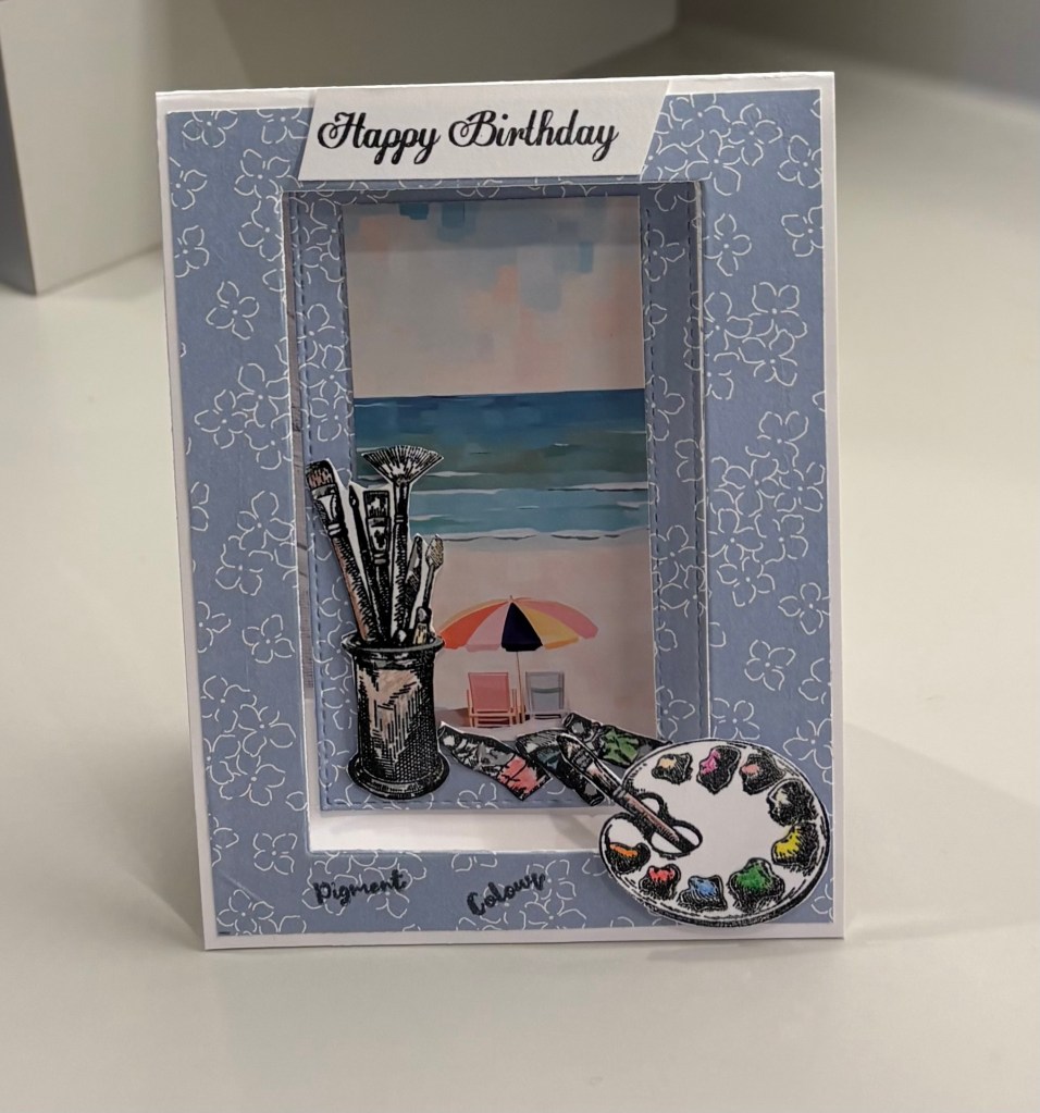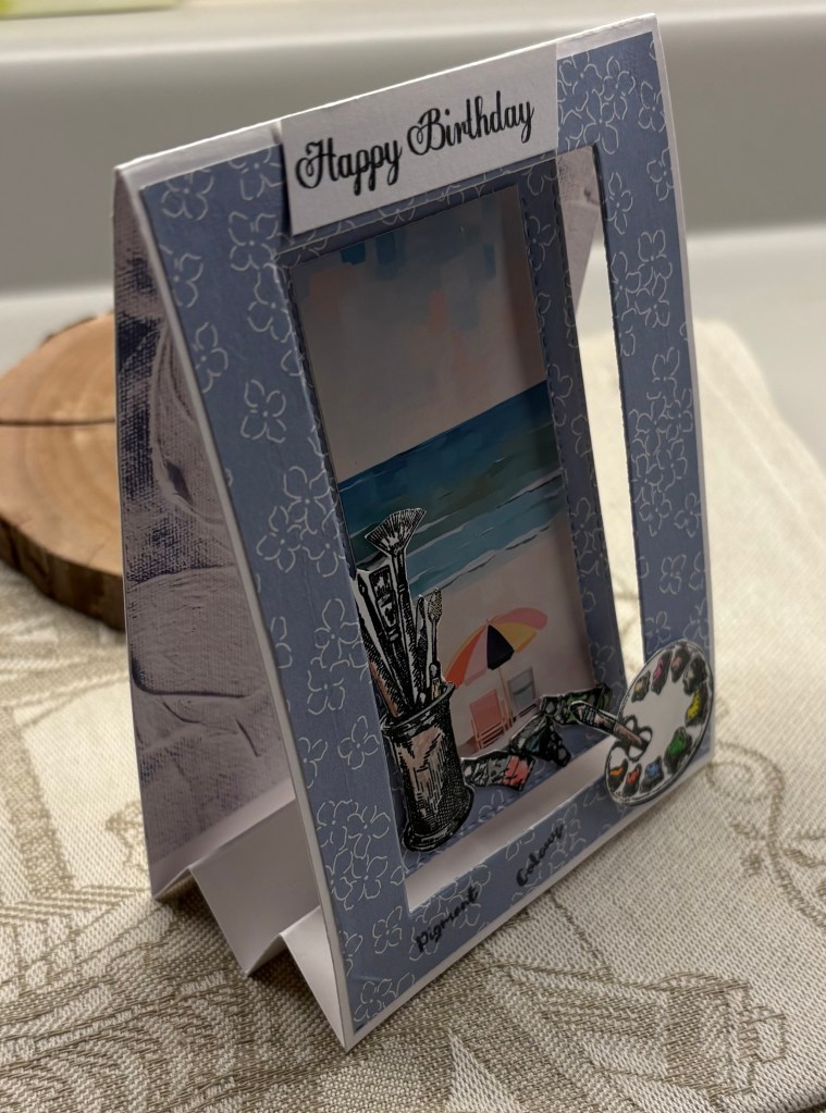 Our artist friend has a birthday coming up soon and I really wanted to personalize a card for her. When I saw this style card on YouTube, I thought it would be perfect to make a painters easel and this is what I came up with. The tutorial is found HERE if you are interested. Our friend loves blue so my first thought was to use blue PP, then my second was realizing I don’t have any stamp sets with artist tools. She is also an award winning photographer so I thought about doing a card using that as a theme, but I’d done several of these for my hubby and wanted something different. In the end I looked online to see what I could find that would be useful and found a set by Globeland on Amazon. Cheap stamps but good enough for what I needed, but no matching dies so I fussy cut the images. And the order was delivered this morning which was perfect.