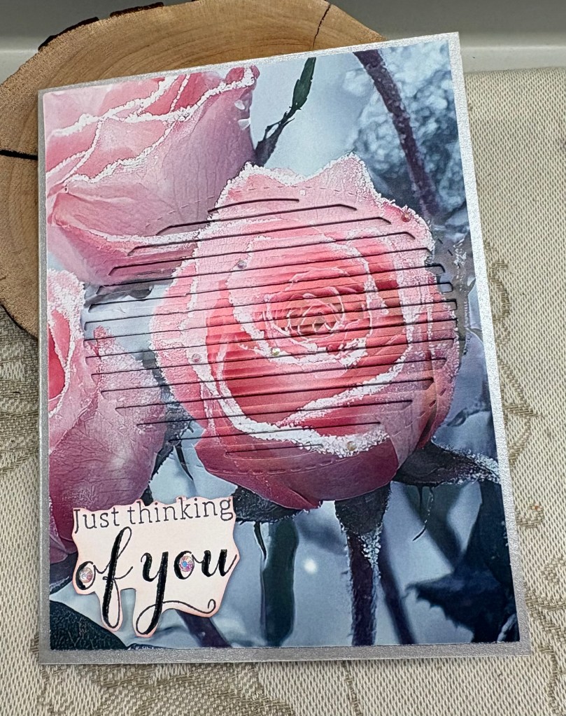 Such a gorgeous card with those winter roses. I was fascinated with the roses and enlarged the picture. I can see where you added the gems on the roses and the sentiment to give some sparkle when moving the card slightly, however, each rose petal, leaves and stems are beautifully outlined with frost. WOW card and love the background silver colour.