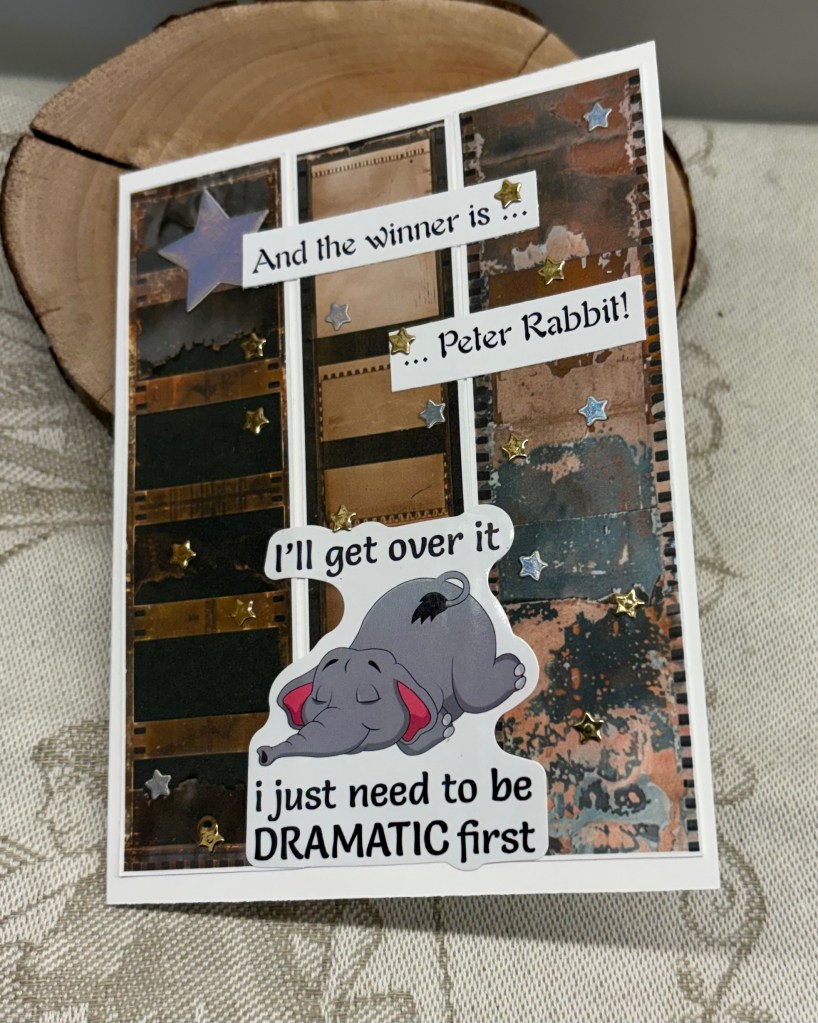 Great idea using the film strips on the card with the academy awards theme. Adorable elephant will have to try to win next year.
