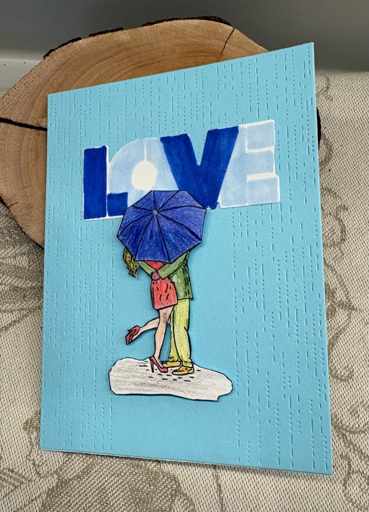My image is from an old Inspired by Stamping set and I coloured this with pencils then fussy cut it. Before attaching this to the card front I turned it over and using a shaping tool made the umbrella look more dimensional. To ensure it wouldn’t collapse when being mailed I doubled up on some foam tape and added more to the bodies. After die cutting the word and stenciling in some colour I added it over the gap and then added the image below it. My stenciling skills need some work because my edges aren’t as crisp as they could be. It isn’t my go to technique, and I really ought to use it more than I do.