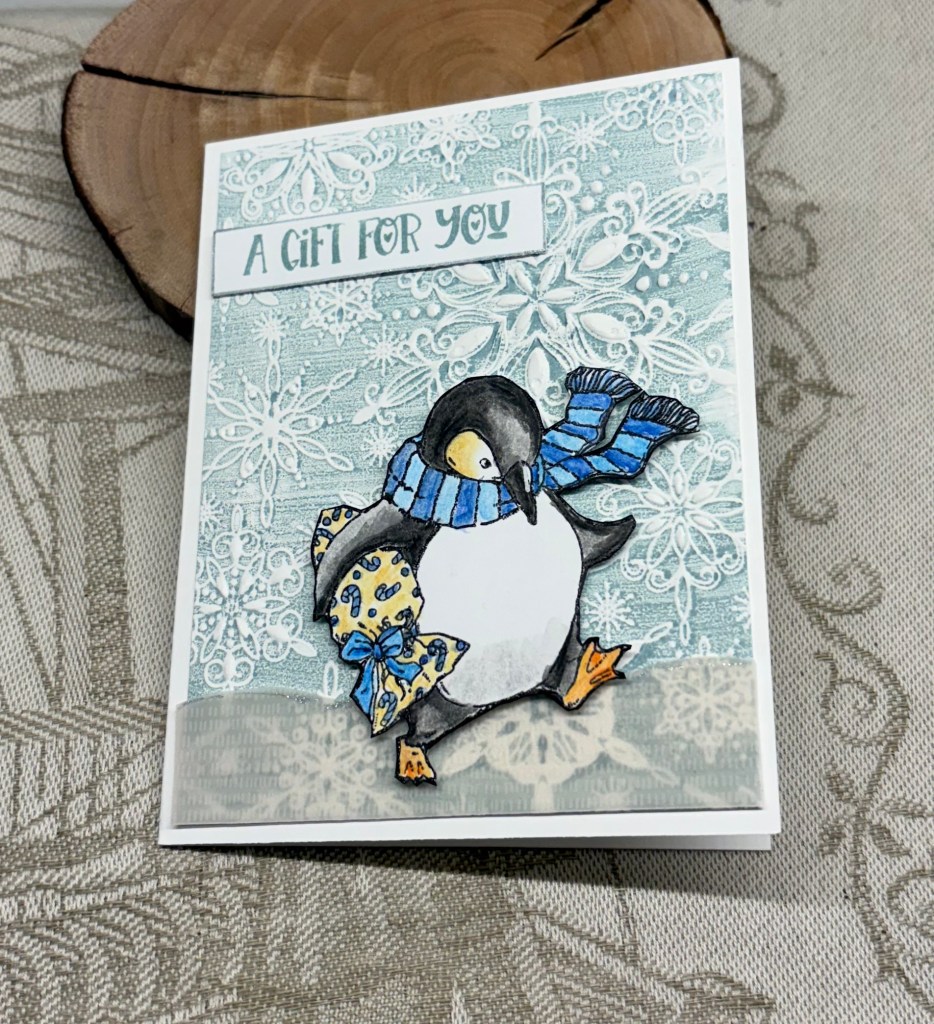 After cutting the strips, I inked them using some cube inks from Crafters Companion and Hero Arts and then I glued them as you see. After stamping and heat embossing the image and sentiment, I added them as you see, keeping it all flat.