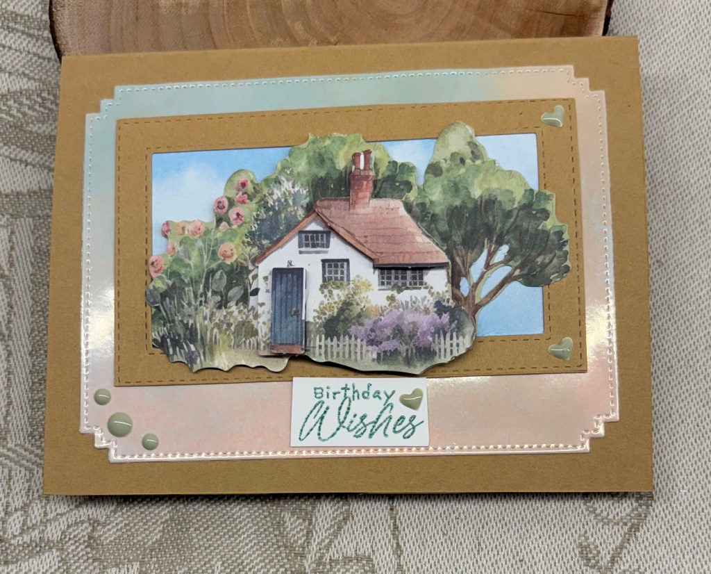Once I had all the pieces in place using foam dimensionals I used a frame die cut using a PaperRose die and backed it with some paper that looked like a sky. After which I added the scene piece. In my scrap box of CS, I found a photo piece and die cut it using an unbranded die. I adhered the scene frame on top of this piece then added a few sage gems from Altenew. I can’t remember which stamp set the sentiment came from but believe it to a Kokorosa set.