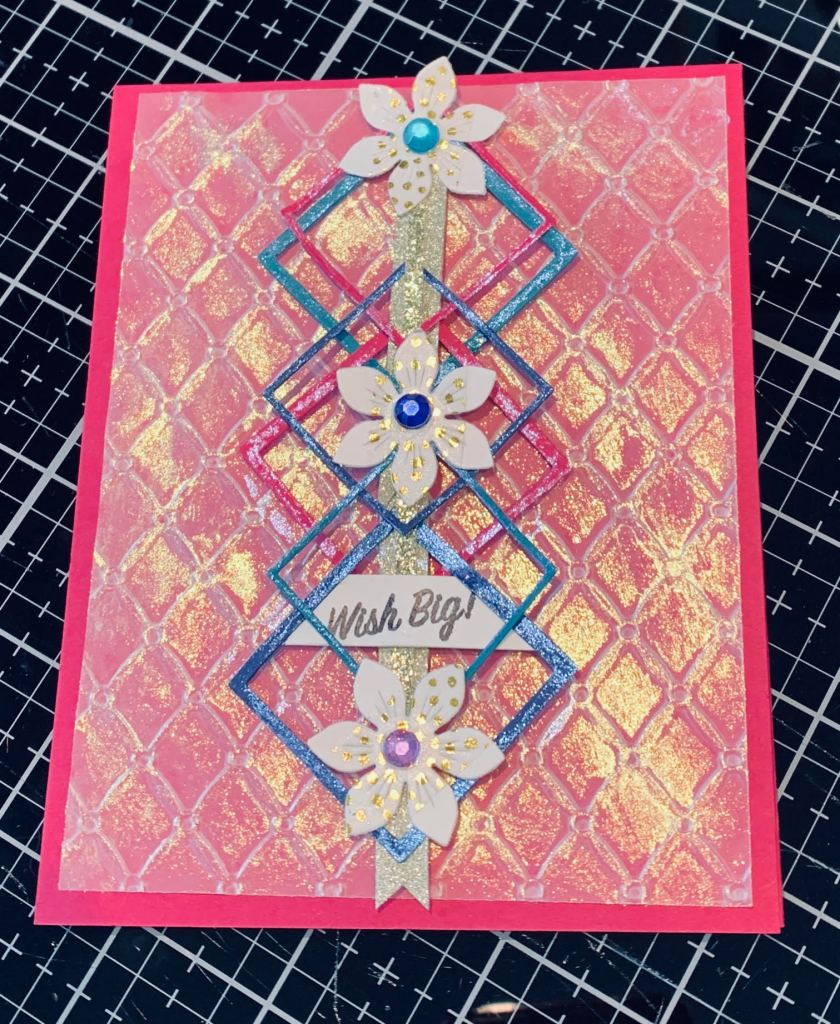 I had the frames and hadn’t decided what to do with them but like the idea of putting them together in some fashion. I played around a bit and glued the 3 bigger ones first and added the strip of glitter card stock through so it looked like ribbon threaded. Then I did the same with the smaller ones using another tiny strip of glitter paper. My new opal blaze pots arrived after I had done this and I had the idea of adding of it around the edges. The shine is amazing. Then I cut a piece of vellum for the CAS Mix up challenge and dry embossed it with the diamond pattern after which I added some of the other opal blaze with my finger. I had some white squares on my desk to which I added a strip of washi tape and then using a GKD die set I cut out the flowers and added them as shown. The sentiment was stamped from the Enchanted Forest GKD set using Stazon ink onto another white Yupo paper square and when dry I cut it and threaded it into the frame. The iridescence on this card is surprising and it shows well in the photo too. The opal blaze changes colour as the card is moved. A friend told me about the challenge at Tuesday Morning Sketches and it fits that one perfectly so I have entered it there as well.