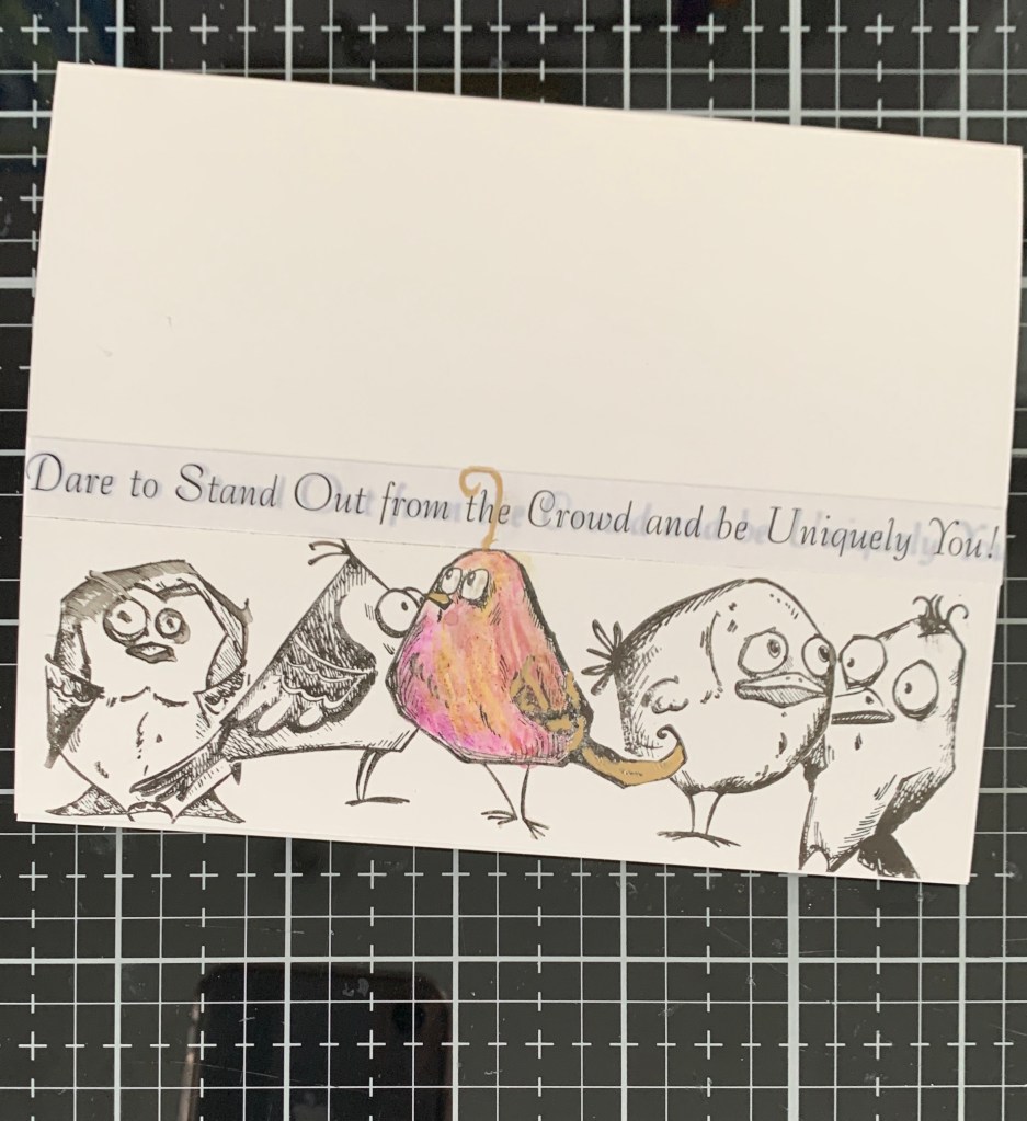 I had seen a card using an elephant to blow bubbles on Pinterest and the idea stayed with me enough to want to play with a version of my own. I matched the colours as close as possible bearing in mind that I don’t have any StampinUp inks. Thanks to a good friend I do have some of the card stock so was able to mat my effort with two of the colours accurately that way. My elephant is a free digi stamp that I resized, printed, hand coloured and fussy cut. I had made a stencil of the smallest window frame die I own and used that to create the background in the close matched colours. Then using a small alphabet stamp set from Hero Arts I stamped each letter to make the sentiment. I added a few pink hearts as well. In addition I stamped the word love at the bottom. Don’t know who made that small set, but think I got it at Michaels a long time ago.