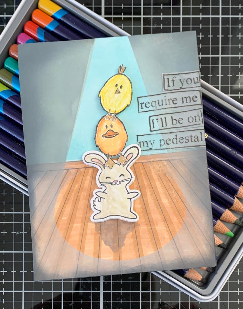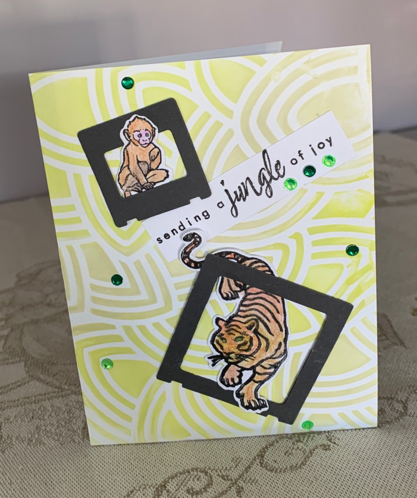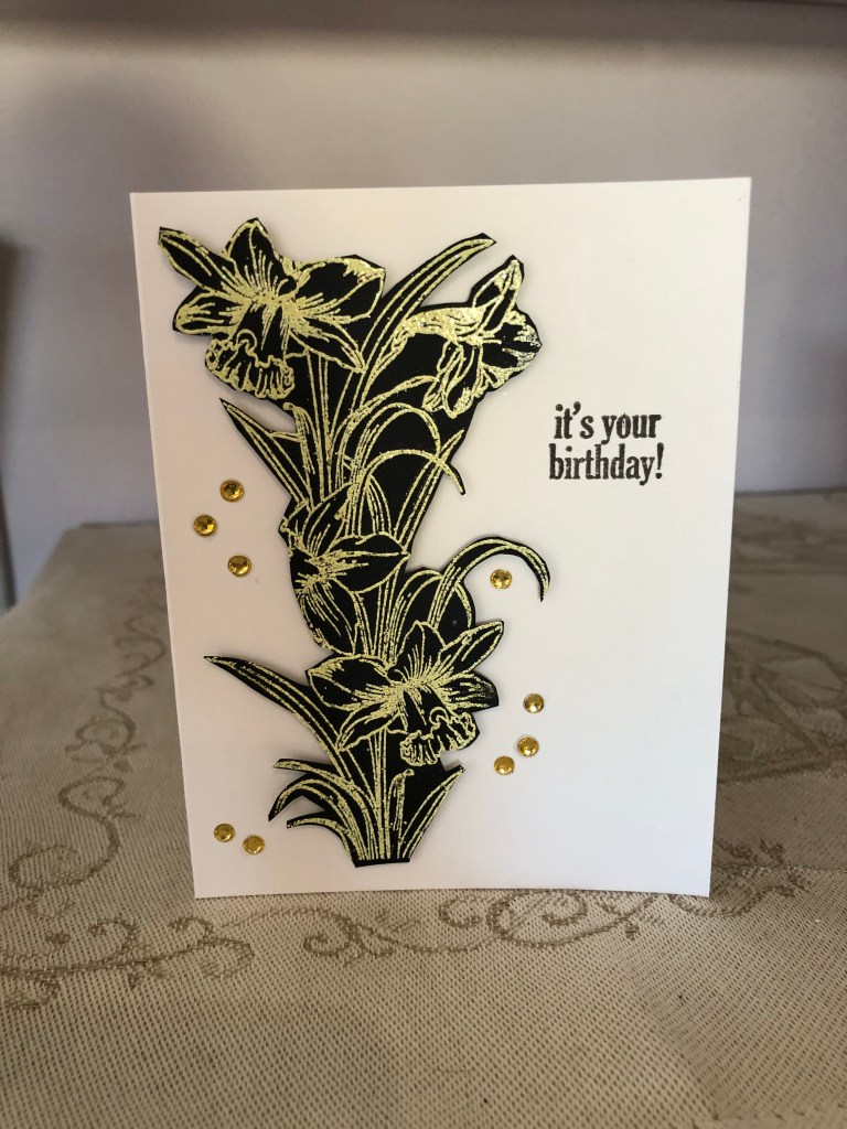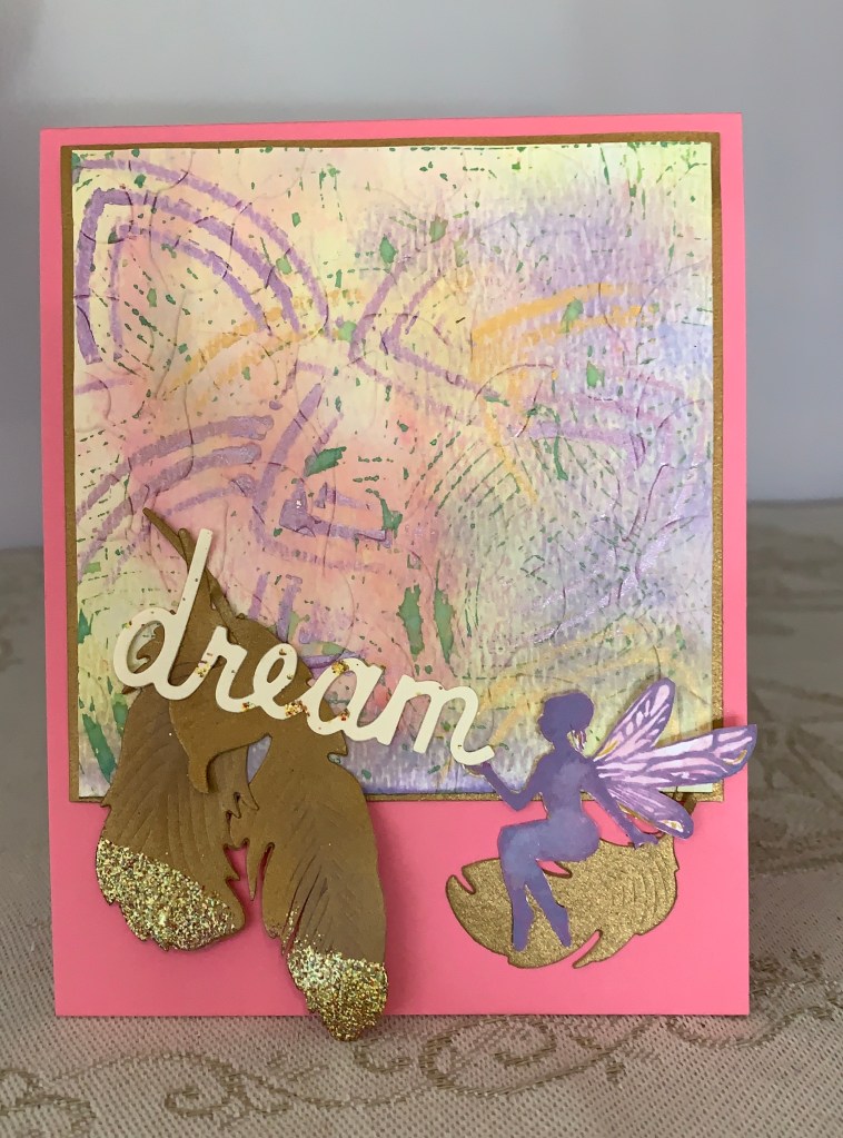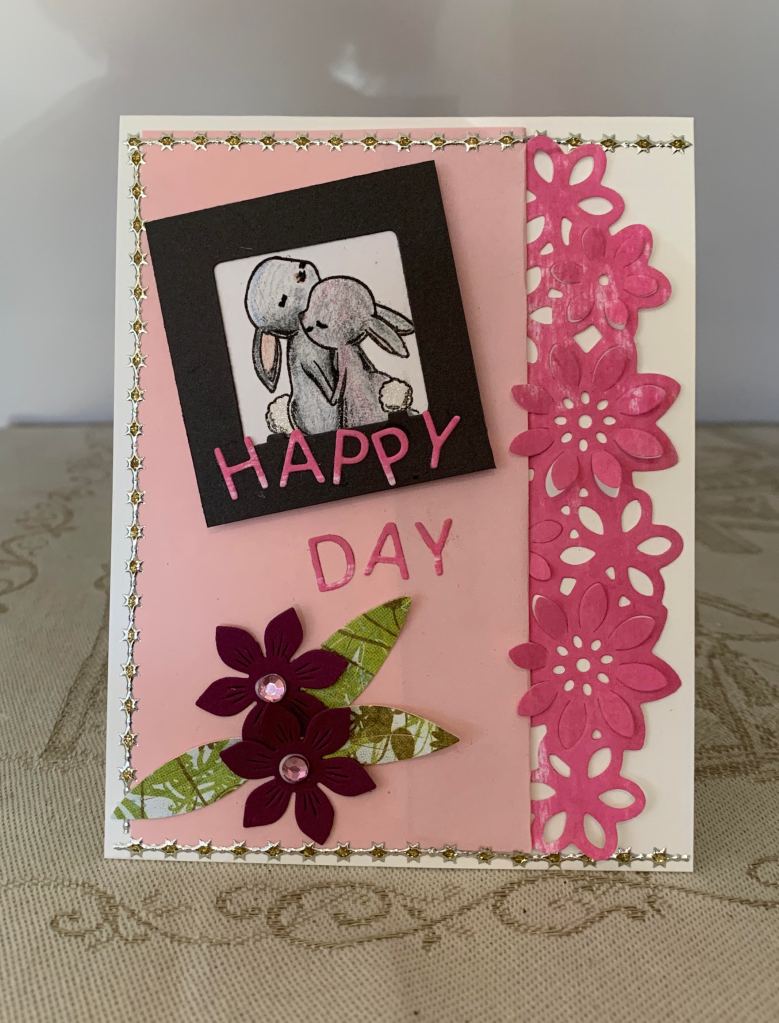 Another new challenge for me and this is the card I came up with. I already had the photo frame negative space and decided that the bunny’s inside a frame would look good. Using a Divinity Designs stamp set, I stamped the bunnies, coloured them and added them into the frame. The bunny tails are glittered. Using a flower border die (don’t know brand or name) and a scrap piece of swiped inked cs I cut the border and glued it behind a pale pink piece of paper, which I then added to card front. I added the bunny frame on an angle and die cut the letters for the words from another Divinity Designs set. Glued the words and decided it needed something else so I die cut the flowers and leaves using a GKD set. Added some pink gem centers to the flowers and a line of bling around 3 sides.
