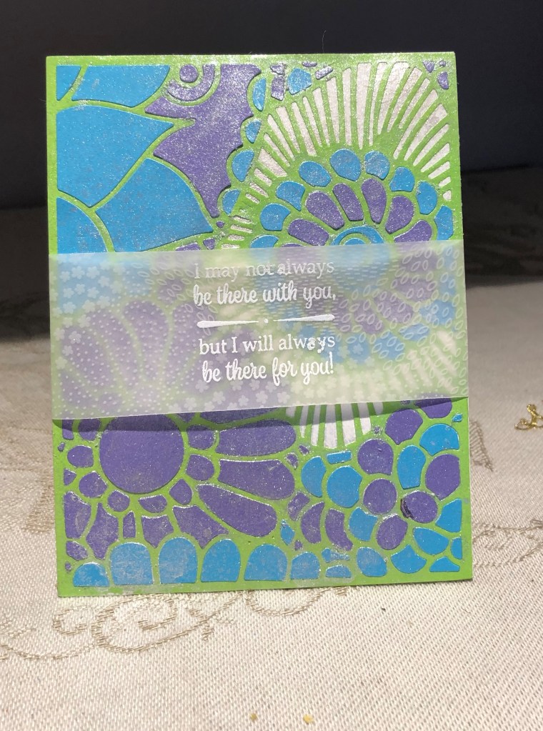 The die is my win from a recent challenge and is by Stamplorations. I wanted to try it out and I thought paper piecing would work for the challenge and make a nice card to send my friend. I can’t believe I decided to paper piece such an intricate die but all things considered it turned out quite well. I ended the design by spraying with Perfect Pearls shimmer as it had a bit of stickiness on top of the card front and I thought this would work to help with that. I was a bit heavy handed in my spraying but the shimmer is pretty never-the-less. I added a sentiment heat embossed on vellum in white to finish it.
