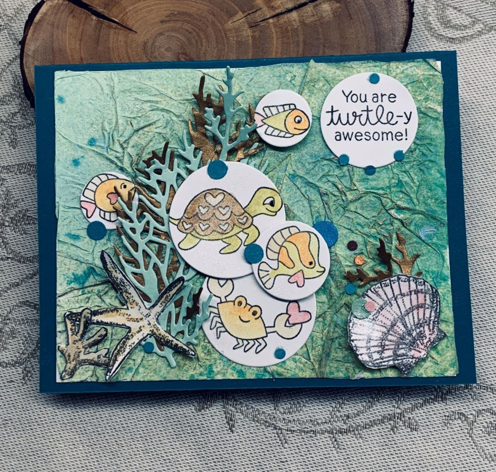 In the meantime I’m watching how to videos and making a card or two. I really like watching Natasha Foote and my post today features one of her techniques using bubble wrap. The challenge at Colorful Options called for blue and this is my take on both Natasha’s card and the challenge colours. I found a piece of the larger sized bubble wrap and followed along with the tutorial getting this background. I added a bit of blue embossing powder to the wet areas so a couple of my bubbles change colour slightly but the main colour used was Blueprint Sketch. I cheated a little bit as the butterfly is from a deconstructed card, received from a stamping buddy, as it was too pretty to discard. Thanks Gayle – it really is a lovely butterfly. Various dies were used for the foliage all cut from scraps of white CS and I added the pale gray blue Lavender stems as well. The sentiment is from an MFT set called Itty Bitty Basics and is one I go back to a lot because sometimes a tiny sentiment works best. The texture one gets from using bubble wrap creates a lovely and different background and it is fun to play with too. I really like how this card turned out and plan on doing more backgrounds using the technique.