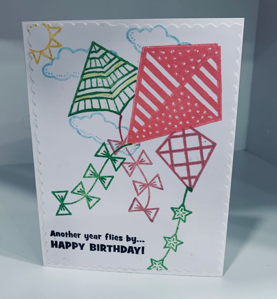 This embossed tulip frame layer by StampinUp has been sitting on my desk for a week or two. When I first made it, I wasn’t happy with it for the card I was then creating. I did cut it down a bit and also cut the middle part of the layer out too. Quite by accident the DSP angled piece ended up underneath the frame and I decided that was a good way to use the scrap DSP. I added a woodgrain piece at the bottom before making the flowers. The flowers and leaves are all from an Altenew stamp set and I used Distress oxides to stamp them. After fussy cutting them out I used some foam tape and then added them to the card front. The card front is the same green as you see in the DSP but looks black in the photo. The word was stamped and die cut from a GKD set called Stitched leaves and I added the embossed word to the black shadow before adding to the card. Rather than add any embellishments to this card I just added some sparkle to the flower centers. Thanks for looking.