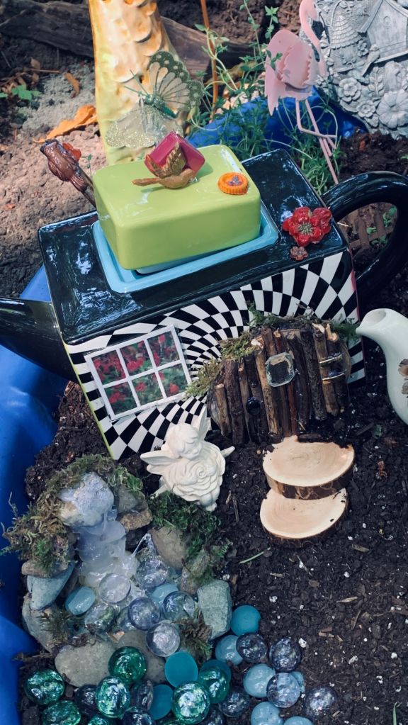 When I found this particular teapot at a garage sale I immediately thought it would make a great fairy house as it is so brightly coloured. I made the window and sealed it in plastic. The door was done by using a wood cookie and gluing twigs on top. I used some old button centers for the hinges and door handle and a square clear gem for the window in the door. Added a bit of moss and it was glued to the pot. the wood cookie steps make it easy for a fairy or gnome to get inside. I used some silicone molds and some clay to make the flowers on the roof as well as the bird nest and bird. At the beginning of the water feature, made from flat glass marbles, I added a kind of pool using an old CD as the base and adding pebbles around it. I then used hot glue to create the look of water and the waterfall. After adding some moss here and there it looked quite realistic although as with everything, I have since figured out a better way to make it. The local dollar stores have come in handy for a few inexpensive bits and pieces so there is a metal flamingo, and between the rock house and teapot is a metal fence with crows on it and a free standing larger toadstool behind the garden as well as a resin decor piece that I’ve had for ages and hadn’t decided where to hang it at this house. Now it is part of the fairy garden that dilemma is solved.