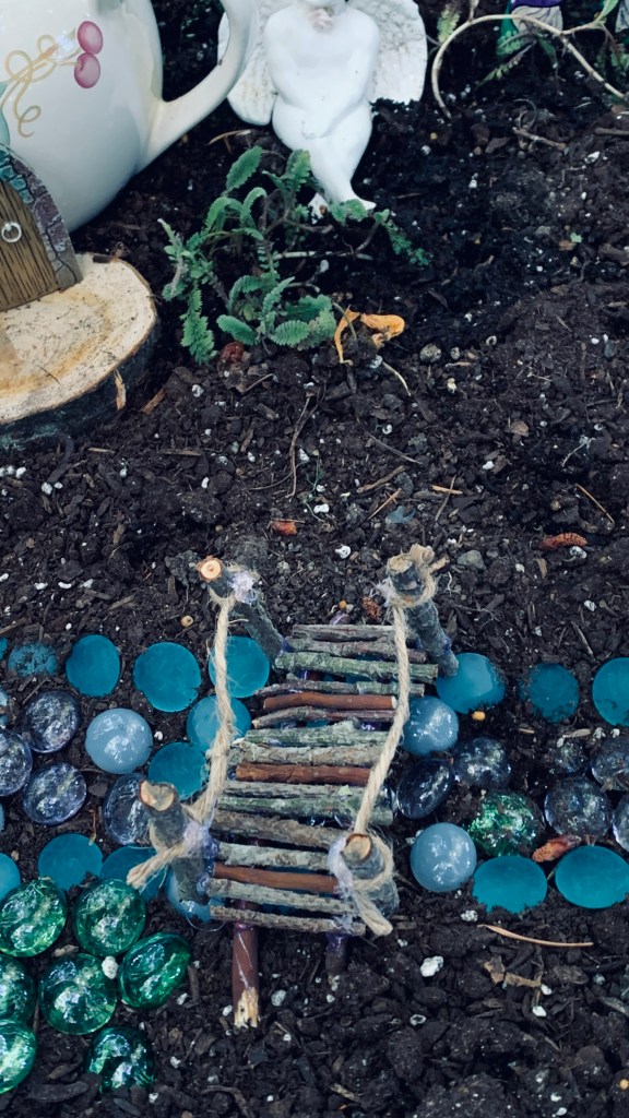 This little bridge was made using twigs cut to size and some string for the ropes. It crosses the narrow part of the water feature. I’m still looking for plants that will work, but as the wooded area is quite shady I have to be careful what I put in. There are lots of places online that now specialize in miniature plants that I’ve seen but I haven’t done a lot of research as yet.