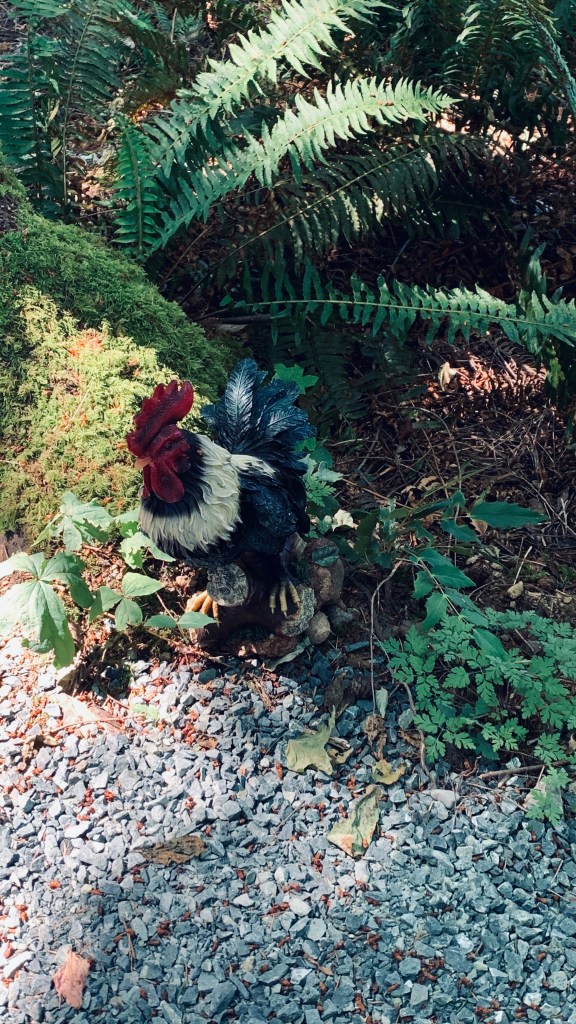 In another space I added this very old 2nd hand gnome along with the frog and in other places there are more roosters all bought at flea markets or garage sales.