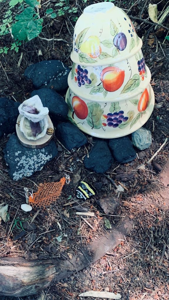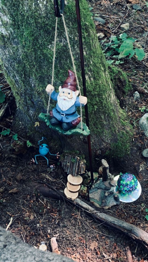 Having a few items around and a large area to fill I created a few other small places for garden kitch and fairy items. The pots in this photo were freebies and I turned them upside down and stacked them crookedly for adding to this section. I have another item to go on top but it isn’t quite ready yet. The rocks are from a local beach as are the shells and I added the shells onto a wood cookie and then some resin to look like a small tiered pond. I made the hammock and since the photo have found a tiny drunken gnome lying on his side so he has been added to the hammock. The painted rock is my first try and I found a natural black stone so I added the stripes and face to make a bee. Have more rocks to play with when I have time.