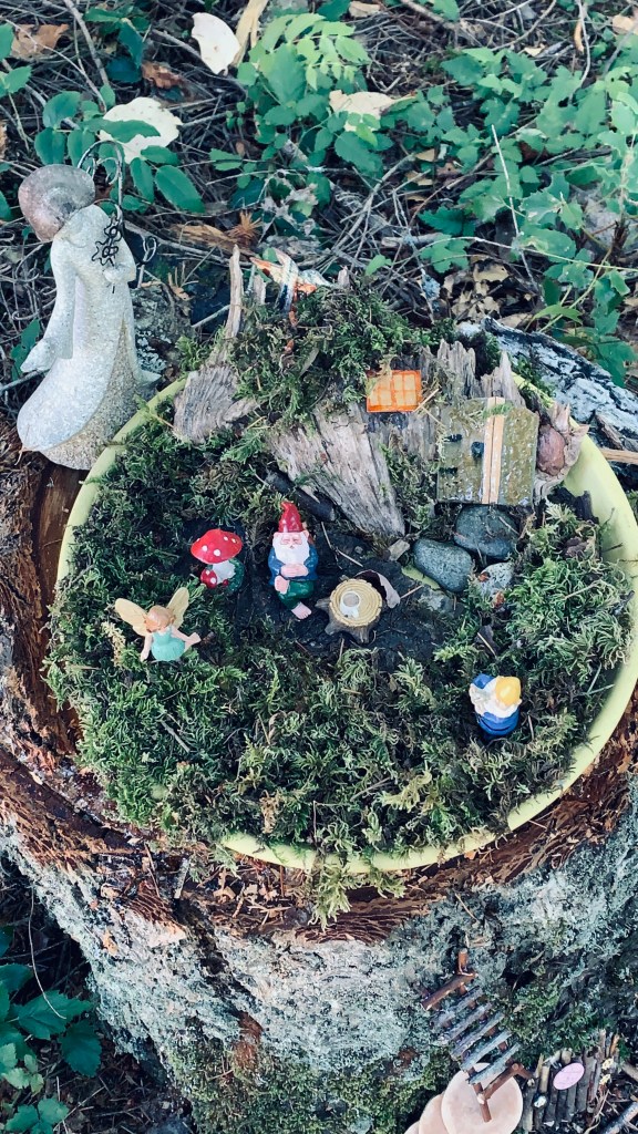 This piece was the first attempt at doing a garden but then I realized that small doesn’t work well in the large spaces we have, so the pool garden came about because of this. The tray is actually a pot tray that wasn’t in use so I added a lot of moss to the tray and then set the decor into the moss. The house is made from a piece of wood and bark to which I added a cork door and a window. the fairy and gnomes are all store bought and the stone angel at the back is a garage sale piece. I love the little gnome sitting with his beer on the table. Wherever I could I have used resin on top of items to hopefully weather proof them a little. The larger garden may get a cover in the winter months as storms will bring down a lot of debris I’m sure.