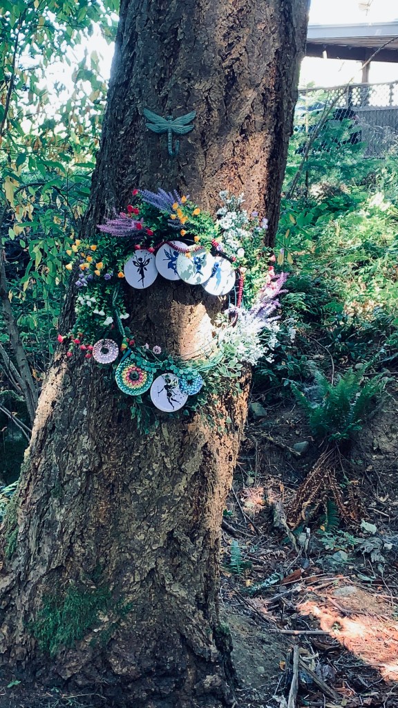 Finally finished the wreath and got it hung on a tree close to the larger fairy garden. Mainly plastic flowers so hopefully not a problem if it rains. May bring it inside during the winter months. The dragonfly hanger was found in an antique store. The fairy hangings are old repurposed CS’s. I used a freebie set of fairy graphics and printed them onto paper. I then glued them to the CD fronts. To help keep them from damage I painted resin over the top of each one. Hubby added holes so I could hang them as you see in the image. Added a few gem covered CD’s as well so it sparkles when the light catches it. I’ve found a tutorial on using CD’s for other decor items so may get to those one of these days.