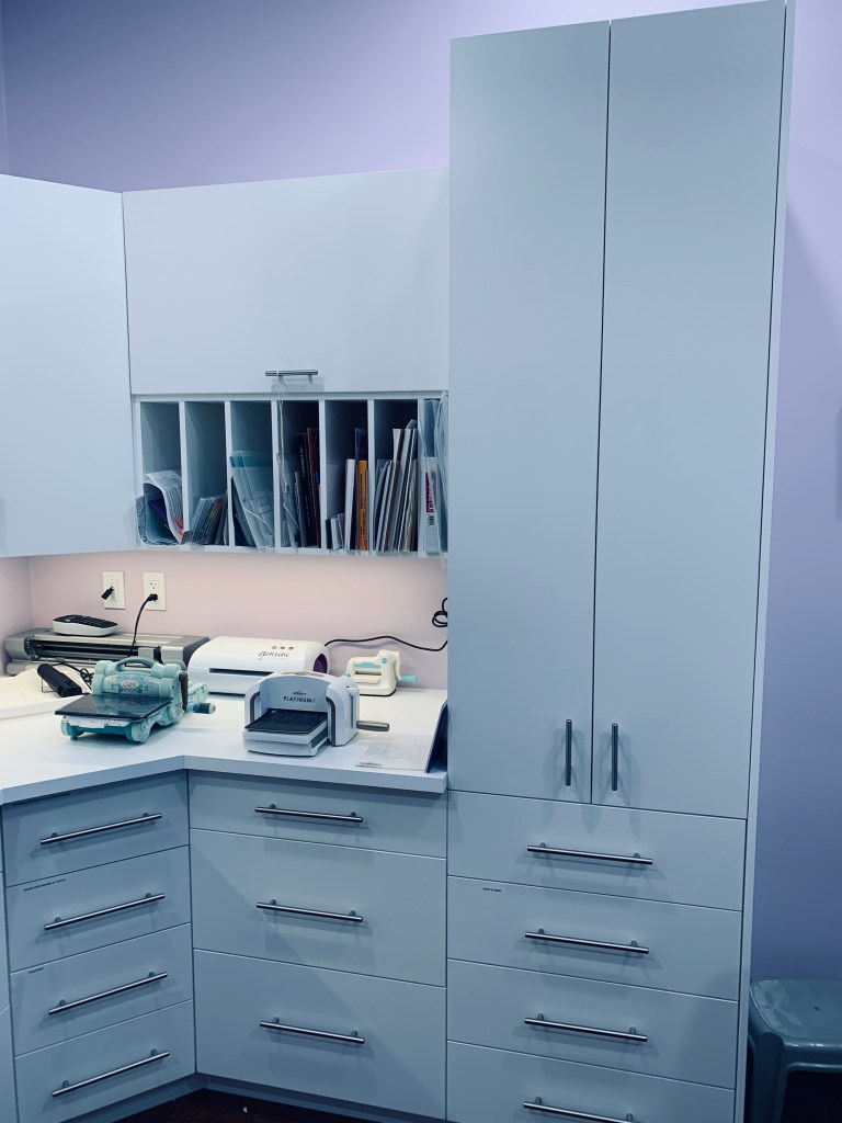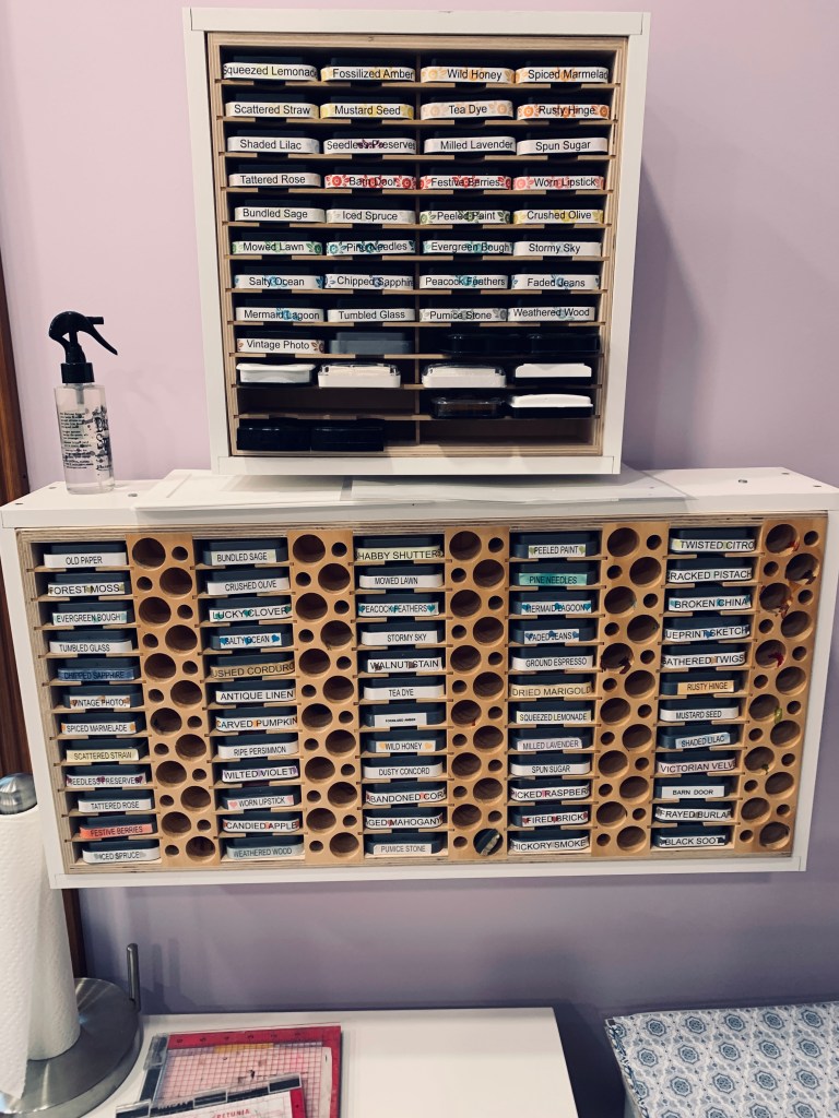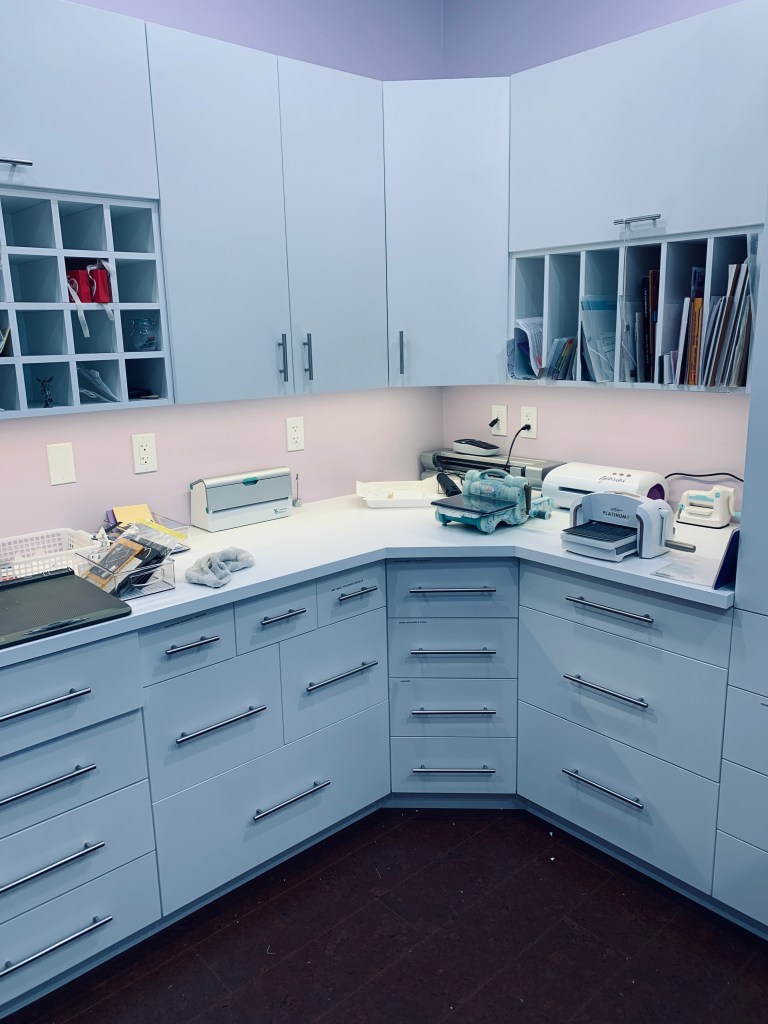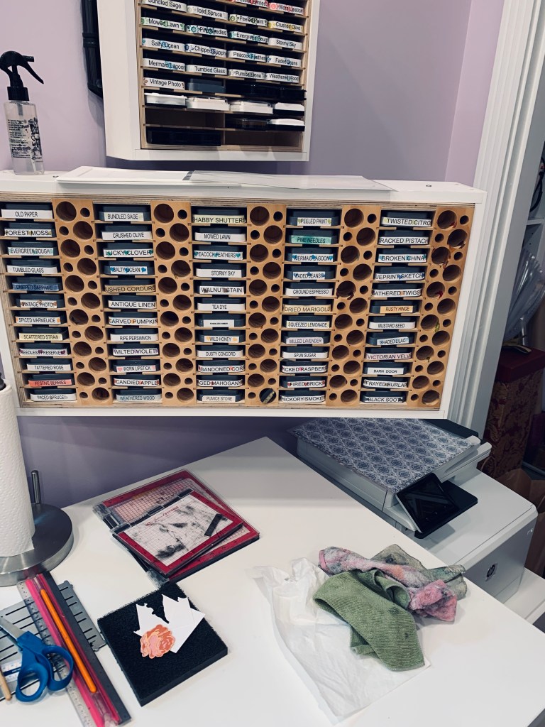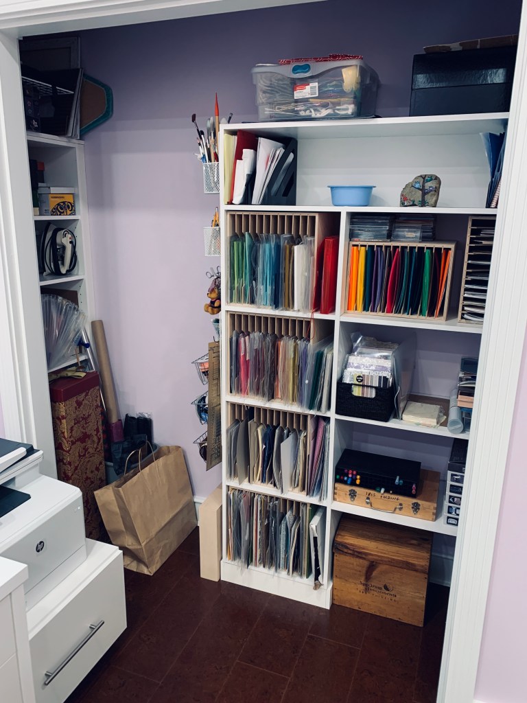 Our contractor designed much of my room around my stuff and you can see that some drawers have another smaller draw within them. It makes it easy to store small stuff and my old wooden block stamps now have a proper place to live. He also created a block for several draws that has slits cut into it and this holds many of my magnet cards for dies. Makes it easier to find something although I still have to label them and put them into a more usable order. I’m working on this and also on colour coding my stamp sets, but it is certainly easier to have the dies standing so they are viewable at a glance.