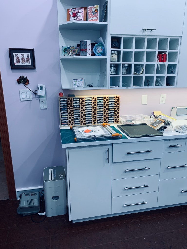 In the photos the walls look pink but they are actually a pale lavender colour and my flooring is a dark cork. Easy to clean up and my chairs roll smoothly on it too. In one photo you can see the ink container sitting behind the cutting plate but was installed on the wall today. I feel very blessed to have this wonderful space to work in and my window looks out onto the wild section of our garden and also to the neighbors house next door.
