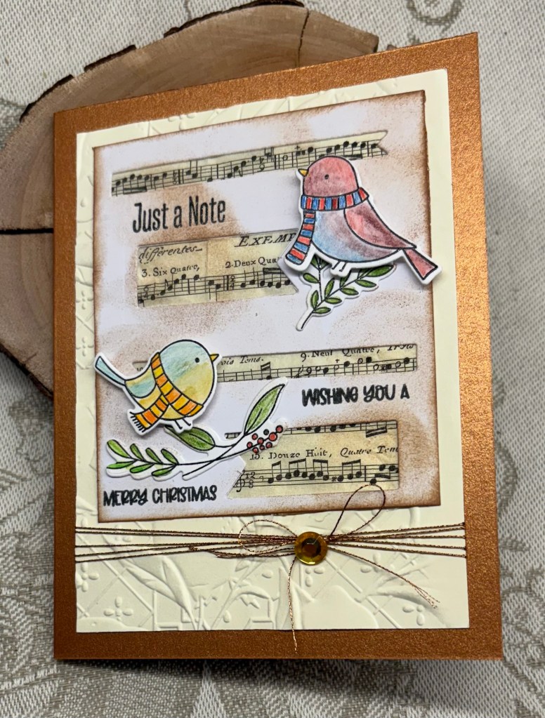 The other day I was playing with a napkin image of musical notes and I attached a larger portion of it to some card stock for a future background. With the piece leftover I was about to set it aside when I wondered what it would look like behind an opening? On my desk was a scrap piece of CS that I had already die cut some banners from and I placed this over the top. It looked good so I cut two more banner openings from the opposite direction then attached it to the napkin piece. After trimming the edges I decided to ink around them and slightly on top to age the CS a little. I remembered that I had this MFT set of bird and die stamps so on another scrap piece I stamped two birds and some foliage. Coloured it all with pencils and water, die cut them and attached as you see here. I used the Just a Note sentiment, from the set, at the top, but as I’d decided I wanted it to be a Christmas card the wishing you and Merry sentiments came from a Divinity Designs set. I had the embossed piece leftover from a project and I added the bird piece to this. Taking some copper thread I added a few turns and tied into a bow before adding the small gem to the middle. Then I added the layers to the main card front. Not a good day for tying bows as it took me more than 10 minutes to do with a bit of swearing thrown in.