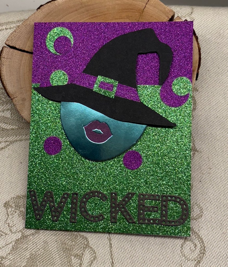 Challenge #260, as chosen by Helen is to use purple and green and to make mine I used some glitter paper from Scrapbook.com in both those colours. The face and lip dies come from Spellbinders and the inspiration came from several cards seen in the private group for a kit I received as a birthday gift. I’m not allowed to share the photos from this group, but one crafter did make a card that helped me to make mine. I hand drew and fussy cut the hat and decorative band and buckle. The letters are from an older die set by First Edition Crafts and I used a couple of dies from HeroArts infinity circles as well.
