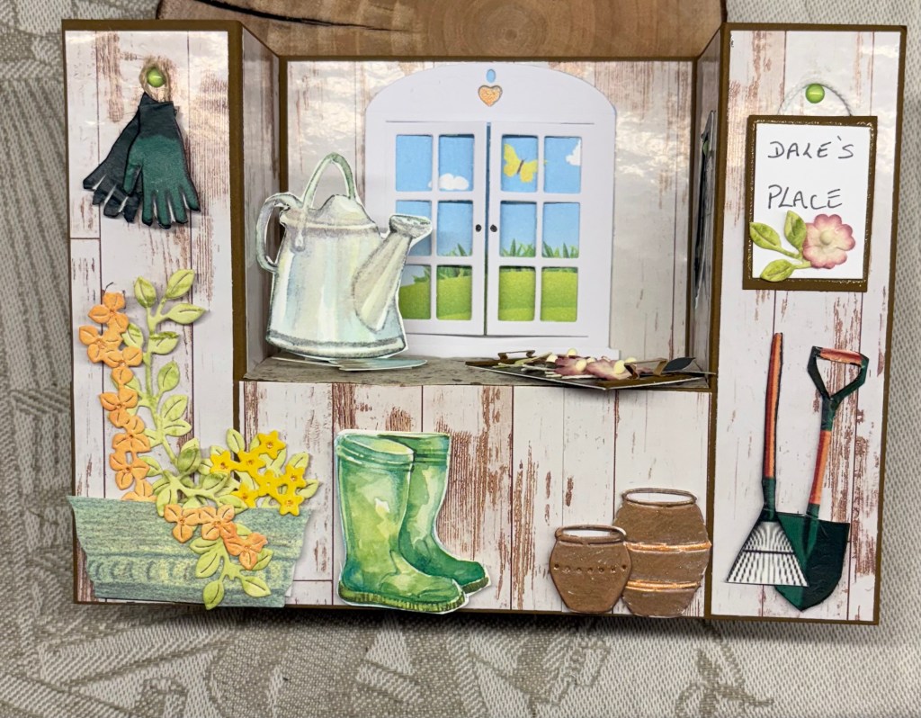 Our friend, who is always so generous with her time and talent, has a birthday coming up soon. She is a keen gardener and I wanted to make her a special card. Having done a bench style card for my hubby earlier this year, I had the idea of making another in a garden theme. I returned to Sam at https://mixedupcraft.com/2020/06/13/cute-bench-fold-card/ and this time CASE’d her card. In my case I don’t have a garden stamp set or dies, but I did have some pieces cut from a store bought card that I had saved and with my new Spellbinders kit could make florals and some pots. The gloves, rake and shovel were Internet sourced which I resized, printed and fussy cut. Like Sam I created a tray even including handles and I added some tiny flowers I’ve had forever and incorporated a few die cut leaves as well. The window is an A.I. die and the scene in the window is cut from another item I saved, which I think came from a chocolate box or similar. The wood grain paper is a dollar store product and the counter top is from my stash. I hand made the sign adding some cord and a tiny gem to hang it from. I did the same thing with the gloves and also with the saw hanging on the inside right panel. The planter is from my stash and I cut it down to make it work better and disguised the section where I added the piece together, with flowers. My flowers and leaves were sponged with distress oxides and I coloured the two pots with a copper marker and then some Sakura gel sparkle. I figured out how to add the watering can so the card can still be folded flat although as we see our friend often I’m hoping to give it to her rather than mail it.